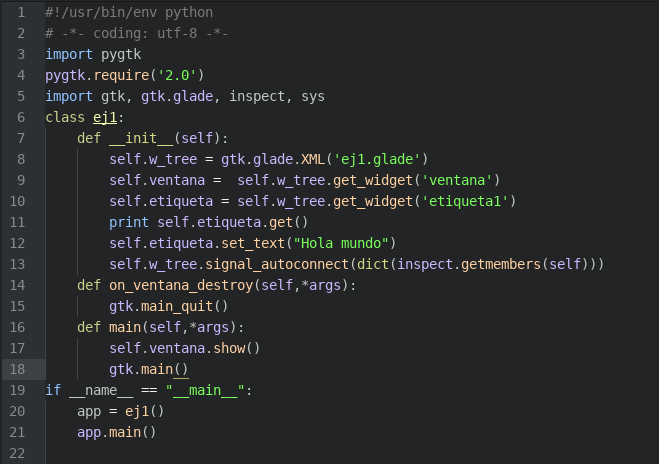La primera línea define el interpretador de comandos a utilizar, en este caso python. La segunda línea define que se usará UTF-8 en el formato de texto. Las líneas 3,4 y 5 se importan módulos y se define el requerimiento de versión de gtk. Línea 6 se define la clase ej1. Línea 7 a la 13 se define el método init, que se ejecuta cuando el objeto se crea. Línea 8 se captura el archivo XML de glade. Línea 9 y 10 se capturan los widgets ventana y etiqueta1 tal como se llama en el archivo glade. Línea 11 se imprime lo que tiene la etiqueta1, se toma el valor con get(). Línea 12 se cambia el valor de lo que contiene la etiqueta1 con set_text("hola mundo"). Línea 13. Esta línea es la que relaciona los widgets con las señales y los métodos de la clase ej1. Línea 14. define el método on_ventana_destroy. Esté método se usa para cuando se le da clip a la ventana para cerrarla. Línea 15. Llama a la función quit de gtk. Línea 16. Define el método main. Línea 17.Muestra la ventana. Línea 18. Llama a main para la presentación de la ventana en pantalla. Línea 19. Si se ejecuta el script se ejecutará las siguientes líneas: Línea 20. Se crea el objeto. Línea 21. Se ejecuta el método main del objeto.