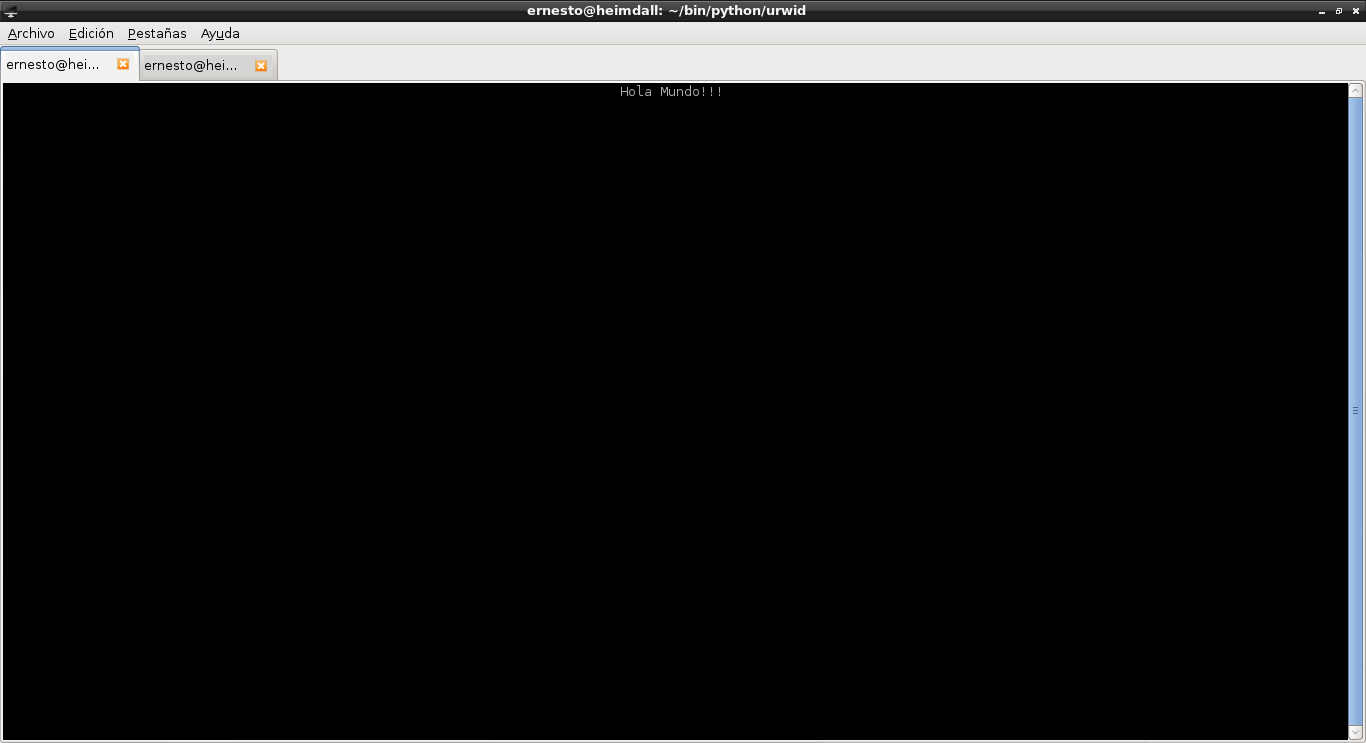#!/usr/bin/env python #Se importa la libreria urwid import urwid #Se define el texto a publicar txt = urwid.Text(u"Hola Mundo!!! ", align='center') #Se define el lugar donde se publica el texto fill = urwid.Filler(txt, 'top') #Se define una funcion donde si se presiona la tecla q o Q se sale del programa. def exit(input): if input in ('q', 'Q'): raise urwid.ExitMainLoop() #Se define un lazo donde se le pasa fill y la funcion de salida loop = urwid.MainLoop(fill, unhandled_input=exit) #Se ejecuta el lazo loop.run()