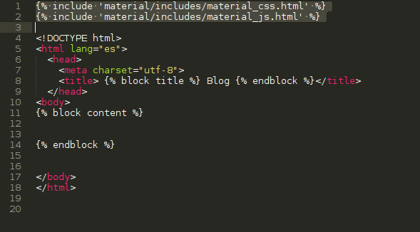 En el archivo base.html se agregarán las siguientes dos líneas las cuales permiten que se use el estilo y javascript a lo material design: