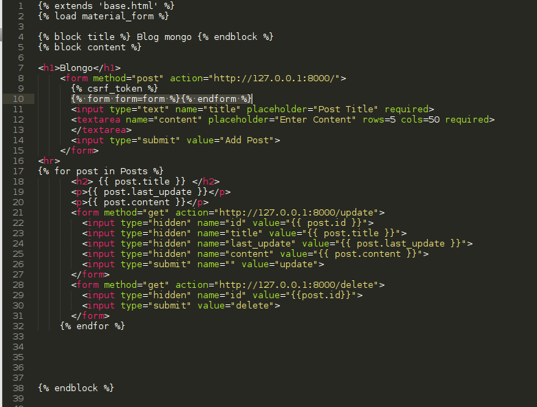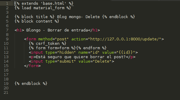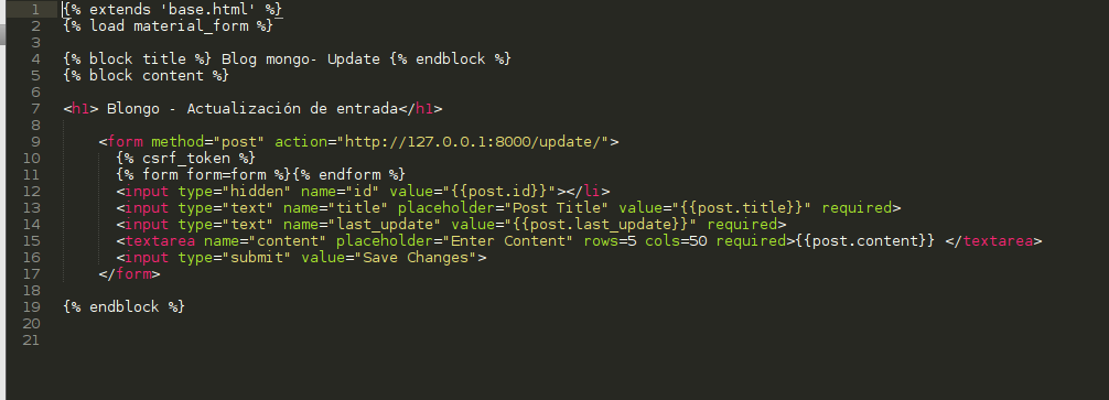 Los archivos index.html, update.html y delete.html tendrán 2 líneas, en una heredan el contenido del archivo base.html y en la otra línea se carga material_form (material design):