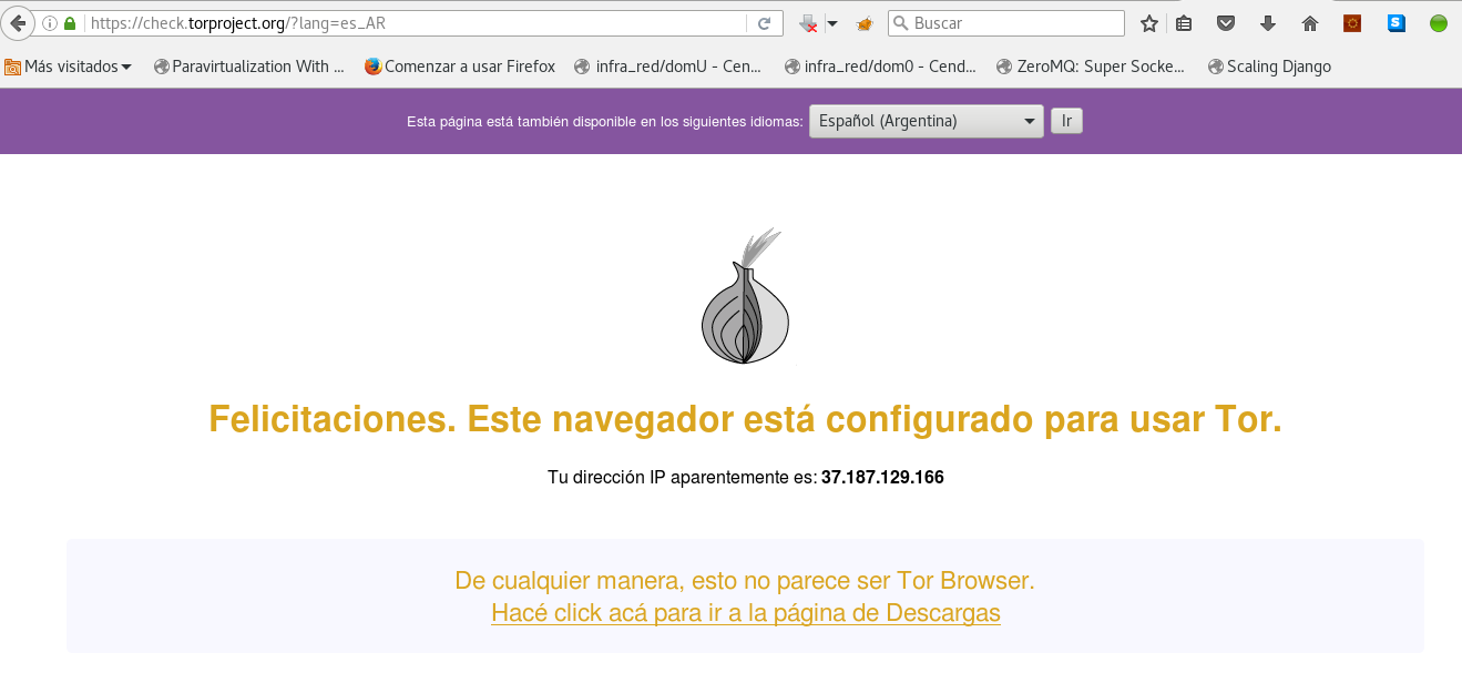 Al verificar con la siguiente URL el uso de tor https://check.torproject.org/?lang=es_AR, se tiene lo siguiente: