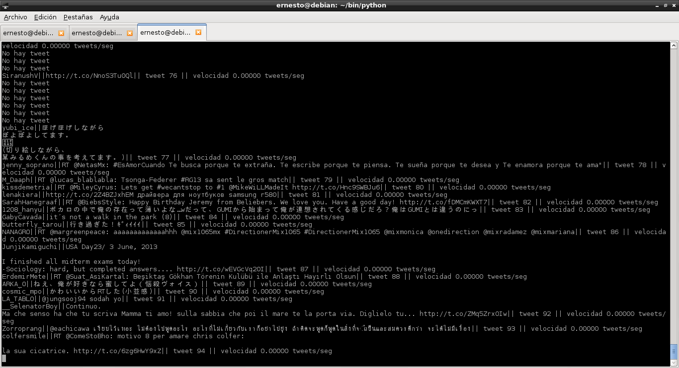 Se muestra en cada tweet, el usuario que envía el tweet, el tweet en si, el número de tweet enviado y la velocidad con que se envía el tweet.