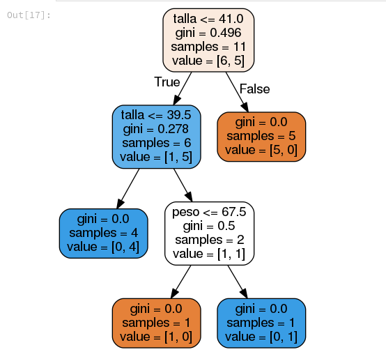 Este grafo se genera a partir de la instancia de la clase que se usa para ingresar los datos, se entrena, y se usa para predecir con nuevos datos. La información que muestra cada nodo de decisión: