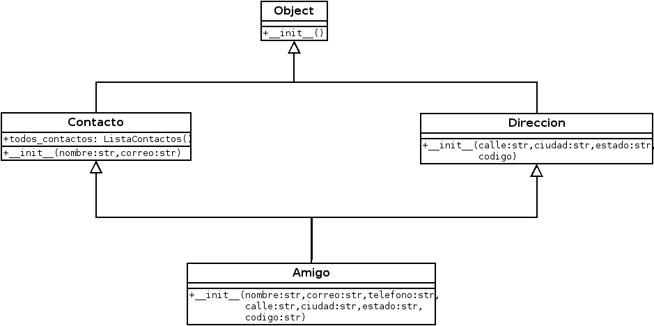 class Amigo(Contacto,Direccion): def __init__(self,nombre, correo, telefono,calle,ciudad,estado,codigo): Contacto.__init__(self,nombre,correo) self.telefono = telefono Direccion.__init__(self,calle,ciudad,estado,codigo)