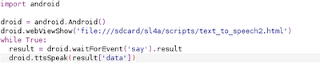 import android droid = android.Android() droid.webViewShow('file:///sdcard/sl4a/scripts/text_to_speech2.html') while True: result = droid.waitForEvent('say').result droid.ttsSpeak(result['data'])