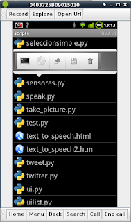 #Importar el módulo android import android #Importar sleep from time import sleep #Se crea la instancia del objeto android droid=android.Android() #Se activa el sensor con un tiempo de activación de 30seg. droid.startSensingTimed(1,30000) #Se crea el mensaje y la info a desplegar en el dialogo. titulo = "Inicio de captura de informacion de los sensores" mensaje = "Espere 10 seg" #Se crea la barra spinner con un tiempo de 10 seg droid.dialogCreateSpinnerProgress(titulo, mensaje) droid.dialogShow() sleep(10) droid.dialogDismiss() #Se captura la información de la precisión, iluminación, acelerometro, #magnetometro y orientación precision = droid.sensorsGetAccuracy() luz = droid.sensorsGetLight() acelerometro = droid.sensorsReadAccelerometer() magnetometro = droid.sensorsReadMagnetometer() orientacion = droid.sensorsReadOrientation() #Se desactiva el sensor del celular droid.stopSensing() #Se crea variables de texto con un formato para mostrar la información textAcelerometro = "" textMagnetometro = "" textOrientacion = "" for i in acelerometro[1]: textAcelerometro = textAcelerometro + "%s," %i for i in orientacion[1]: textOrientacion = textOrientacion + "%s," %i for i in magnetometro[1]: textMagnetometro = textMagnetometro + "%s," %i infoPrecision = "Precision: %s " %precision[1] infoIluminacion = "Iluminacion: %s" %luz[1] infoAcelerometro = "Acelerometro: %s" %textAcelerometro infoMagnetometro = "Campo Magnetico: %s" %textMagnetometro infoOrientacion = "Orientacion: %s" %textOrientacion #Se presenta la información en pantalla. droid.dialogCreateAlert("Informacion del sensor del celular") datos = [infoPrecision,infoIluminacion,infoAcelerometro,infoMagnetometro,infoOrientacion] droid.dialogSetItems(datos) droid.dialogSetNegativeButtonText('Salir') droid.dialogShow() respuesta = droid.dialogGetResponse().result if respuesta['which'] == "negative": droid.makeToast("Saliendo del programa") time.sleep(2)