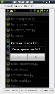 import android # #Se importa la función sleep from time import sleep #Importar el módulo os para usar os.path.isfile y os.remove. import os #Mensaje del programa title = 'Captura de una foto' message = ('Desea capturar una foto?') #Se crea la instancia del objeto android droid = android.Android() #Se crea el mensaje si se desea tomar la foto. droid.dialogCreateAlert(title, message) droid.dialogSetPositiveButtonText('Si') droid.dialogSetNegativeButtonText('No') droid.dialogShow() #Se captura la respuesta si es positiva se pide el tiempo que se desea #usar para tomar la foto. #Si es negativa finaliza el programa. respuesta = droid.dialogGetResponse() if respuesta[1]['which'] == "positive": tiempo = droid.dialogGetInput("Escriba el tiempo para capturar la foto","tiempo:") #Se crea el mensaje del tiempo para ejecutar la toma de la foto. droid.makeToast("Tiempo para tomar la foto: %s " %tiempo[1]) #Se espera el tiempo definido sleep(int(tiempo[1])) #Se toma la foto guardandola en el archivo latest.png.Si la imagen existe #se borra si no se toma la foto. if os.path.isfile("/sdcard/sl4a/scripts/latest.png") == True: os.remove("/sdcard/sl4a/scripts/latest.png") droid.cameraCapturePicture("/sdcard/sl4a/scripts/latest.png") sleep(1) droid.makeToast("Presentando la foto tomada") sleep(2) #Se muestra una página web donde aparecerá la foto tomada. droid.webViewShow("file:///sdcard/sl4a/scripts/captura.html") sleep(120) droid.makeToast("Fin del programa") else: droid.makeToast('Fin del programa')
