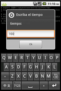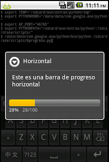 #Importar módulo android y time import android,time #instanciación de la clase android droid = android.Android() #Definir mensajes titulo = "Horizontal" mensaje = "Este es una barra de progreso horizontal" #Se pide el tiempo de ejecución en seg numero = droid.getInput("Escriba el tiempo","tiempo:") #Crear la barra horizontal con título, mensaje y el número droid.dialogCreateHorizontalProgress(titulo,mensaje,int(numero[1])) #Se muestra la barra de progreso droid.dialogShow() #ejecución del ciclo en 0.1 seg de la barra de progeso for i in range(0,int(numero[1])): time.sleep(0.1) droid.dialogSetCurrentProgress(i) #Se cierra la barra de progeso droid.dialogDismiss()