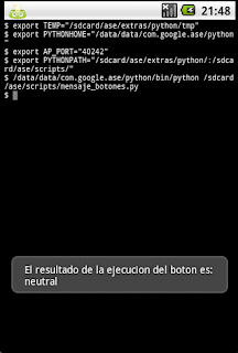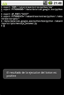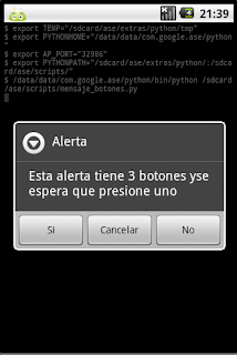 #Importando el módulo android. import android #Crear la instancia del objeto android droid = android.Android() #Título y mensaje del botón. title = 'Alerta' message = ('Esta alerta tiene 3 botones y' 'se espera que presione uno') #Crear el widget de mensaje de alerta droid.dialogCreateAlert(title, message) #Se definen los mensajes de los botones (si, no y cancelar). droid.dialogSetPositiveButtonText('Si') droid.dialogSetNegativeButtonText('No') droid.dialogSetNeutralButtonText('Cancelar') #Mostrar el mensaje droid.dialogShow() #Captura del resultado de darle clip a algún botón. #el resultado es un diccionario. response = droid.dialogGetResponse().result #Se muestra un mensaje con el resultado de darle clip. droid.makeToast('El resultado de la ejecucion del boton es: %s' %response['which'])