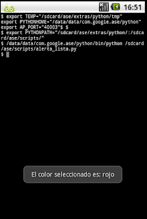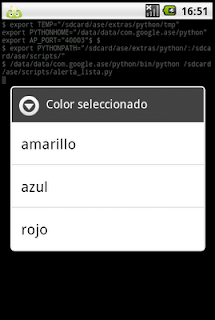 #Importar módulo android y time. import android,time #Se instancia el objeto Android droid = android.Android() #Se crea el titulo del mensaje de alerta y se crea el widget. titulo = 'Color seleccionado' droid.dialogCreateAlert(titulo) #Se crea la tupla con la lista de colores. colores = ('amarillo', 'azul', 'rojo') #Se agrega la tupla al widget de selección simple. droid.dialogSetItems(colores) #Se muestra el widget. droid.dialogShow() #Se captura el resultado de seleccionar un color respuesta = droid.dialogGetResponse().result #El resultado se guarda en un diccionario y se muestra en un mensaje. droid.makeToast('El color seleccionado es: %s' %colores[respuesta['item']])